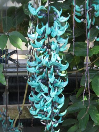 ヒスイカズラはフィリピン・ルソン島特産のマメ科のつる性植物です。英名では“Jade Vine”(Jadeはヒスイ、Vineはつる植物をさす)と呼ばれており、名前のとおりヒスイのような緑がかった青色の花をつけ、花序が長いものでは1m以上にもなります。4月中旬までヒスイ色の勾玉のような花を楽しむことができます。