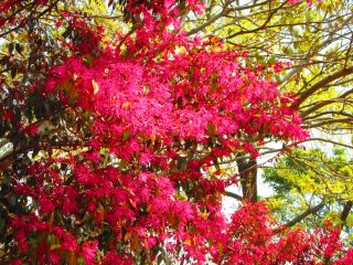 トキワマンサクの変種の常緑の小高木です。鮮紅色で光沢のあるビニール紐を裂いたような花を集合させて咲かせます。鮮やかな色をぜひご覧ください。