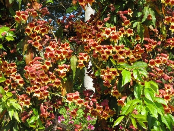学名はBignonia capreolataです。ビグノニアは17世紀の植物学者Bigunonに由来、カプレオラータというのは巻き付くという意味です。