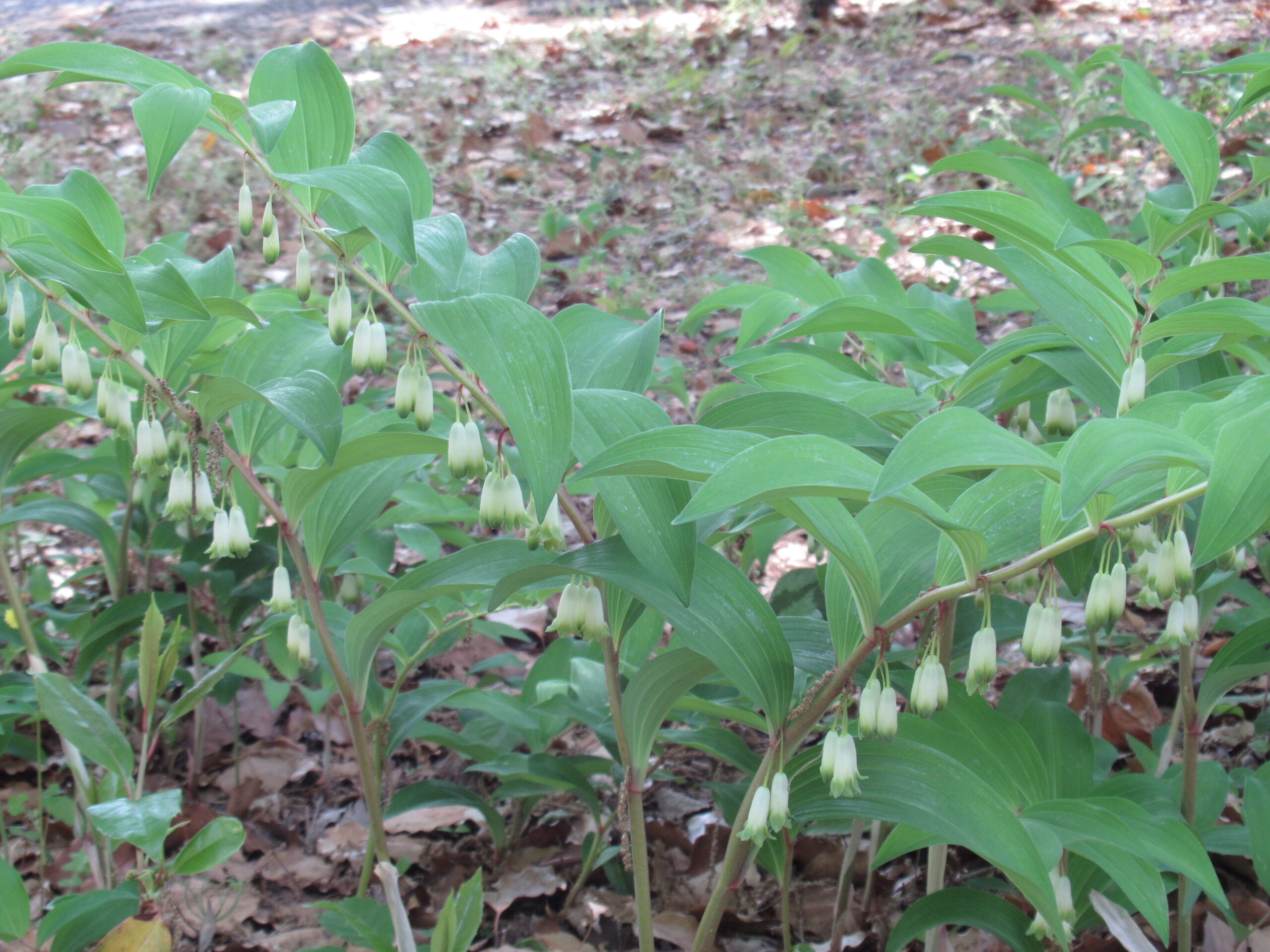 4~5月下旬には、釣鐘形の白い花が1~2個ずつ垂れ下がって咲きます。そして花が終わると青黒く、小さな丸い実ができます。