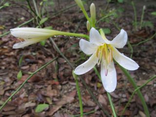 スイセンの名が付いていますがヒガンバナの仲間です。ヒガンバナは花を咲かせて枯れた後に葉が伸びますが、ナツズイセンは秋~春に葉を出して枯れた後に花が咲きます。