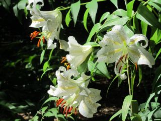 花の大きさはユリ科の中でも最大級で、花弁には白地に黄色い帯状の筋が入り、赤い斑点があります。香りは甘く濃厚でとても強いことが知られています。風貌が豪華で華麗であることから、「ユリの王様」と呼ばれます。