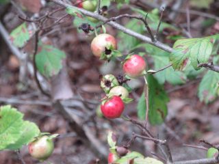 春に咲いた白い花が秋には、ヒメリンゴのような深紅色の果実へと変化します。