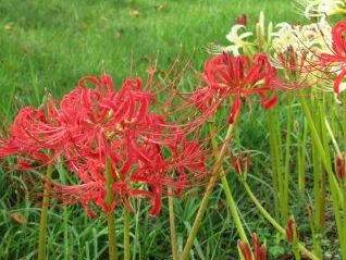 赤と白のヒガンバナが鮮やかに彩っています。ヒガンバナ科の全草有毒な多年生の球根植物で、日本には中国か朝鮮半島から持ち込まれ、稲作と共に広まった帰化植物といわれています。